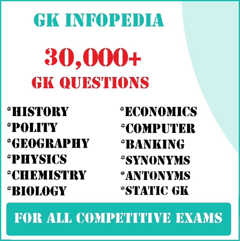 HOME GK SECTION HISTORY GK POLITY GK GEOGRAPHY GK PHYSICS GK CHEMISTRY GK BIOLOGY GK COMPUTER GK BANKING GK ECONOMICS GK ONE-LINER GK RANDOM ONELINER - 25000+ QUESTIONS & ANSWERS HISTORY POLITY GEOGRAPHY COMPUTER BANKING ECONOMICS PHYSICS CHEMISTRY BIOLOGY ENGLISH SECTION SYNONMYS ANTONYMS " Click Here " to Subscribe - GK INFOPEDIA